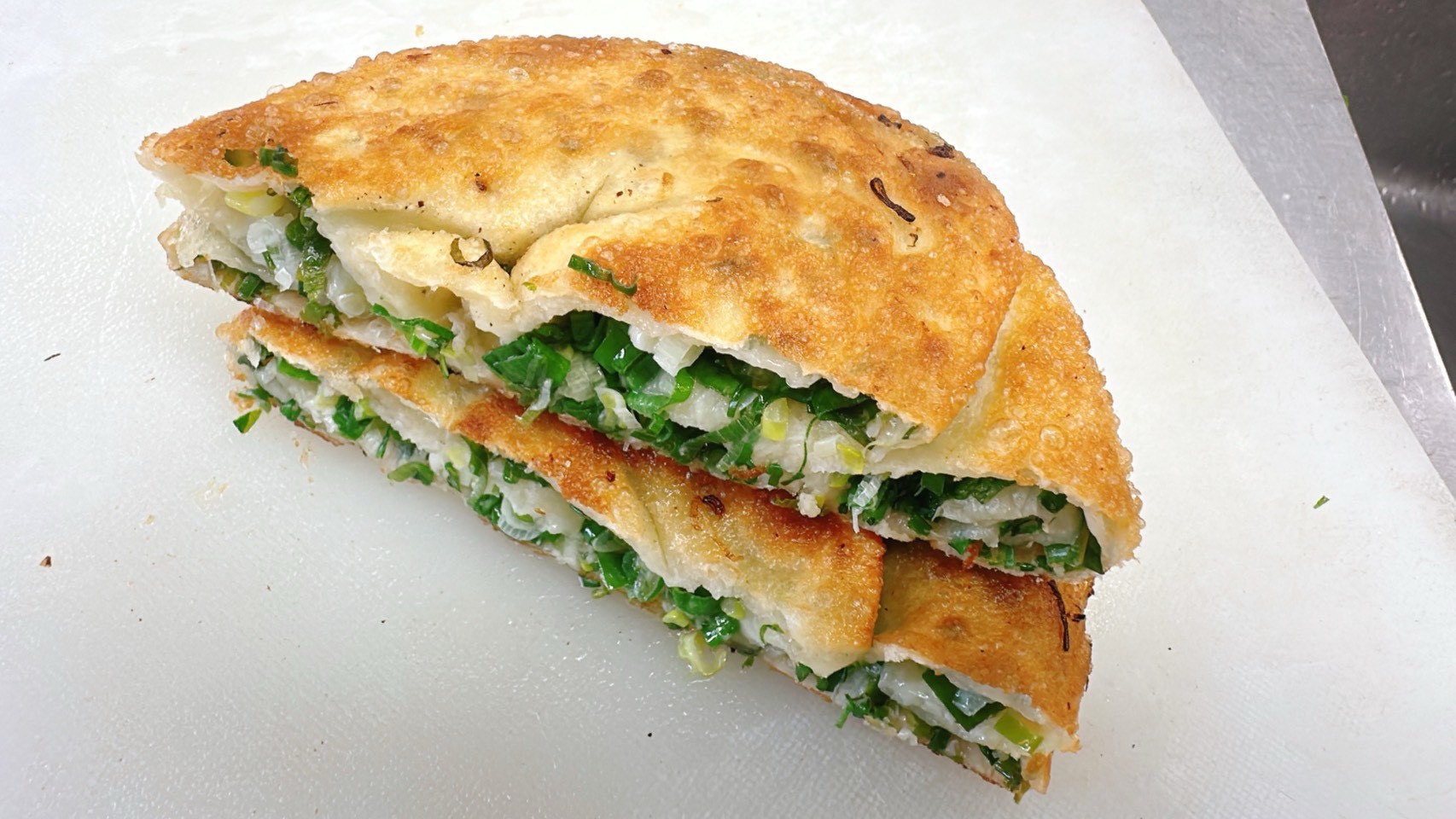 層層分明的酥香外皮,包裹著滿滿香蔥內餡,入口先是酥、然後噗鼻而來蔥香、一口接一口沒有油膩感、